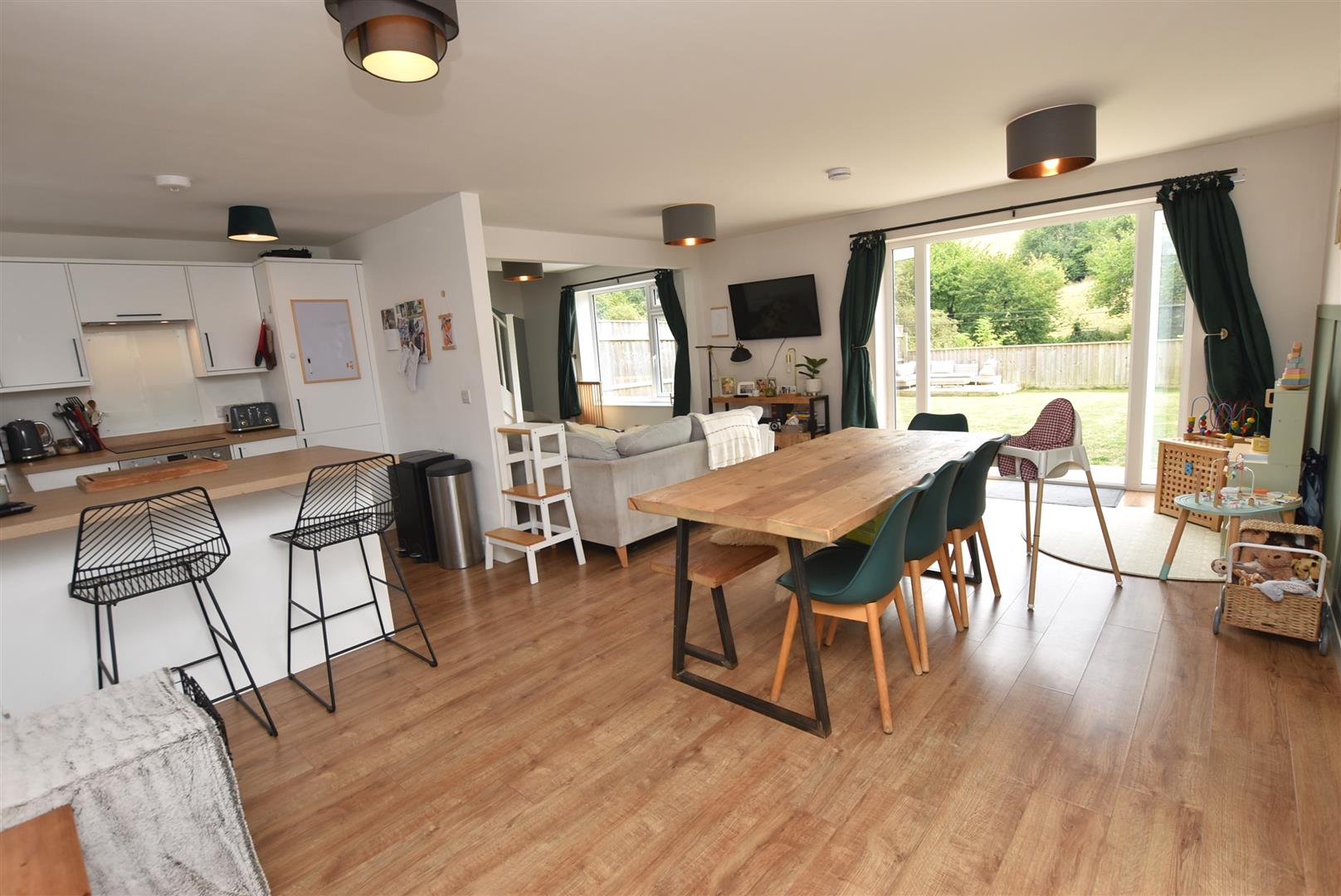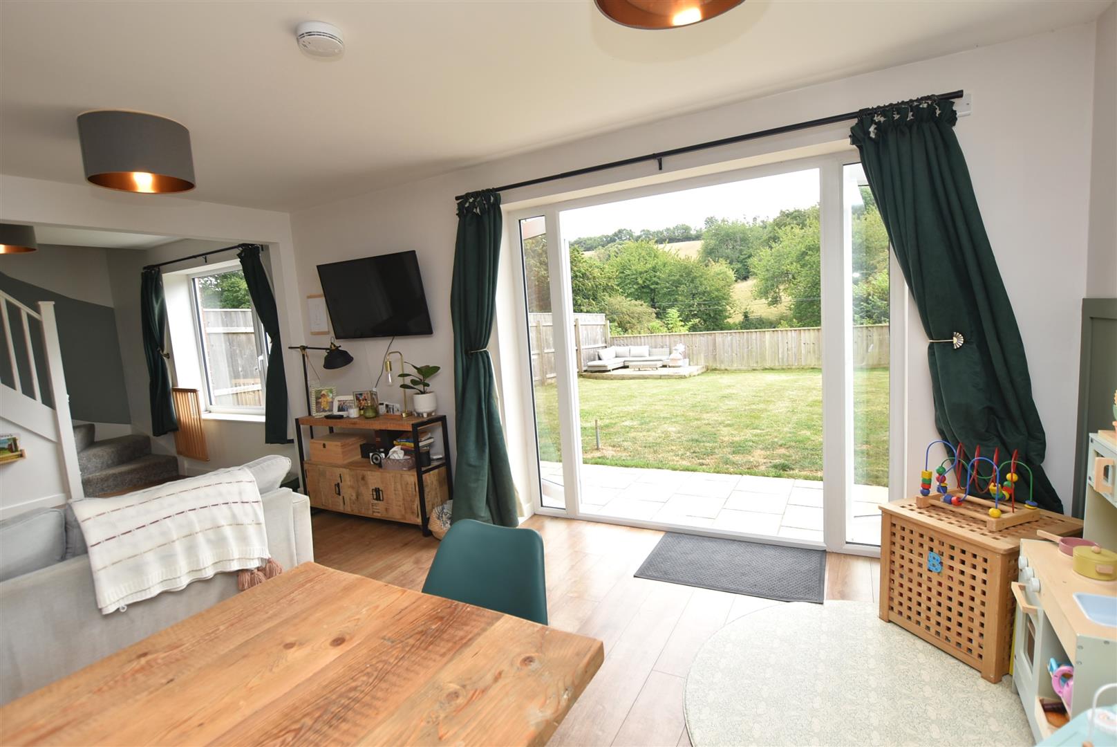 Patio doors open out onto a full width sun terrace and large south facing level garden; the scenic back drop of hillside and trees providing a captivating charm and relaxing atmosphere. On a practical note, having access onto Ludwell Valley Park virtually on the doorstep provides the perfect environment for energetic children, keen walkers and dog owners.
