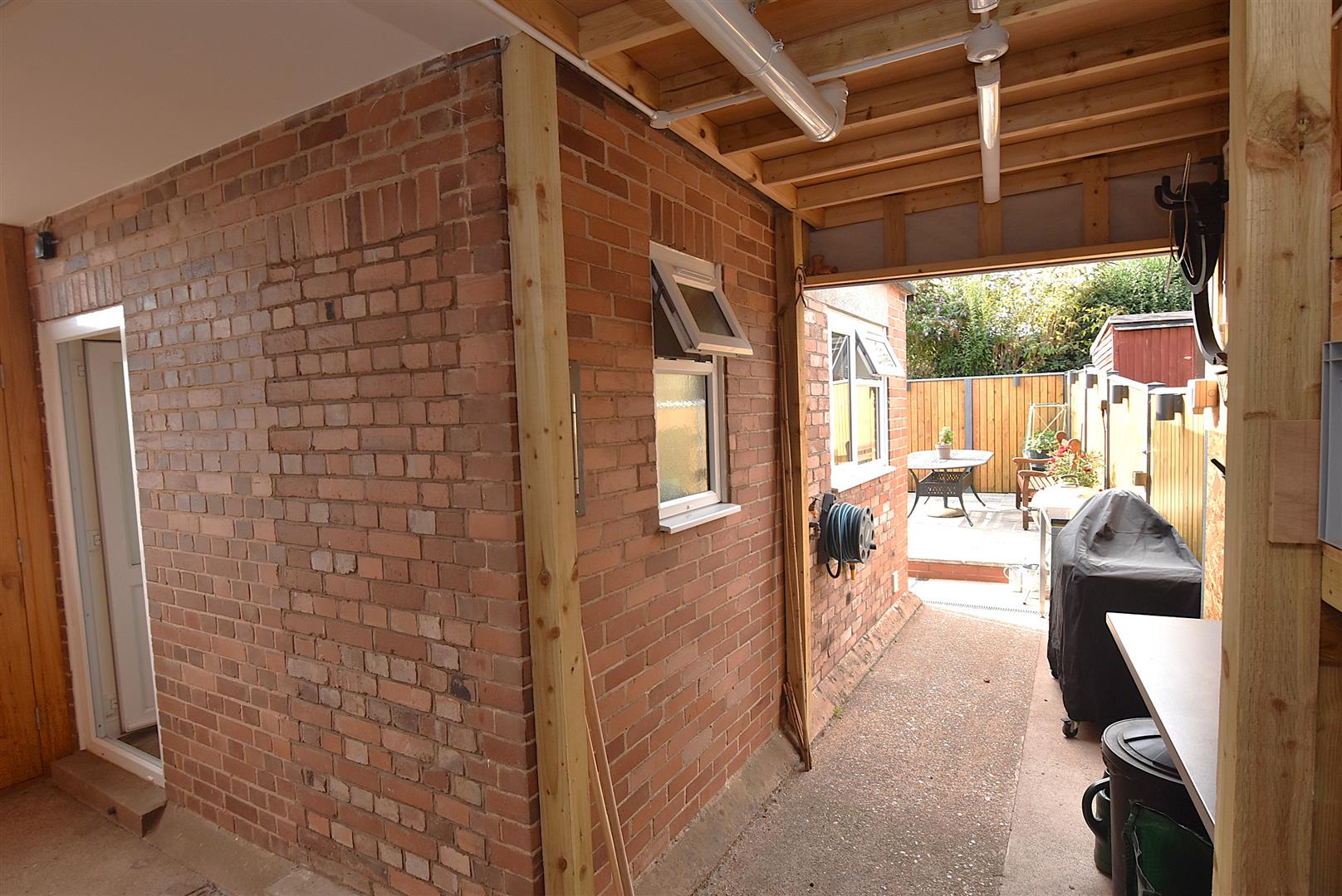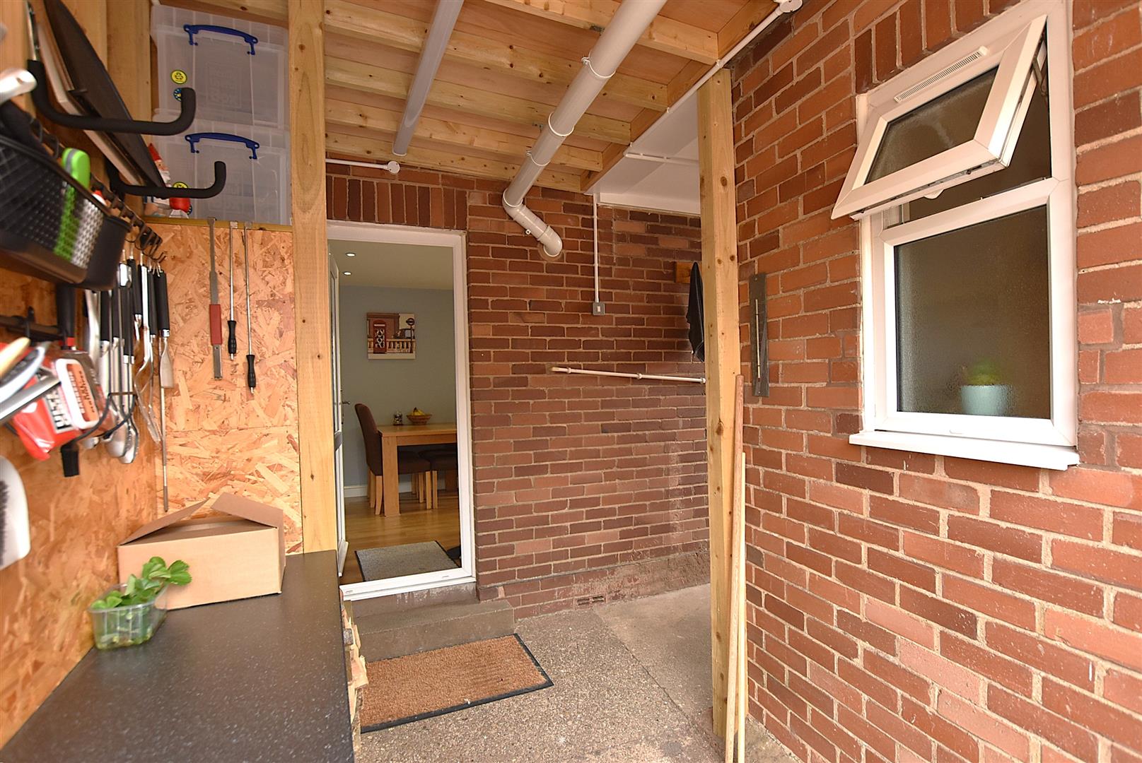This large covered area opens onto the rear garden and has secure double doors leading to the driveway and garage. A door also links with the cloakroom/WC and utility room.